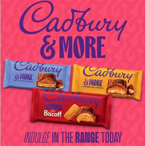 The Cadbury &More Biscoff Chocolate Bar (195g) is an indulgent, large-format bar designed to provide a rich, textured experience. It features creamy Dairy Milk chocolate filled with a smooth Biscoff spread centre, topped with crunchy Lotus Biscoff biscuit pieces. This "More" range product is part of a premium redesign, offering more flavour and layers